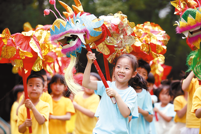 5月30日,浙江省温岭市中心幼儿园的小朋友在舞龙。