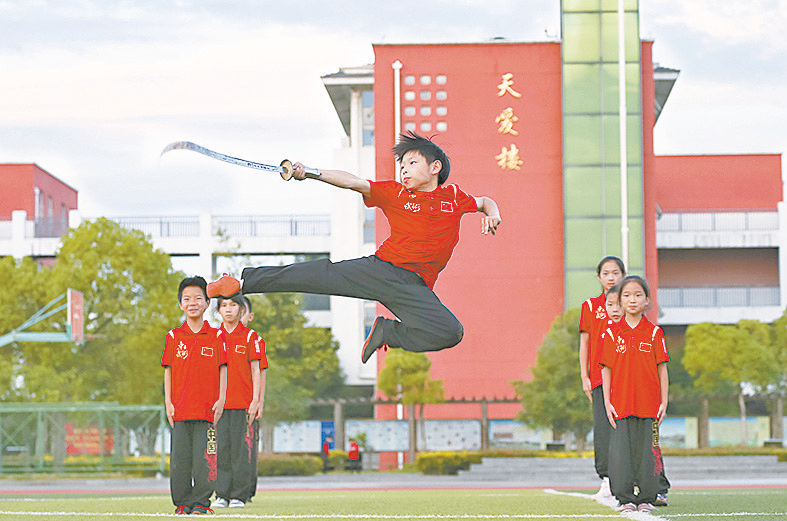 5月29日,江苏省镇江句容市天王中心小学武术社团的学生在练习武术。