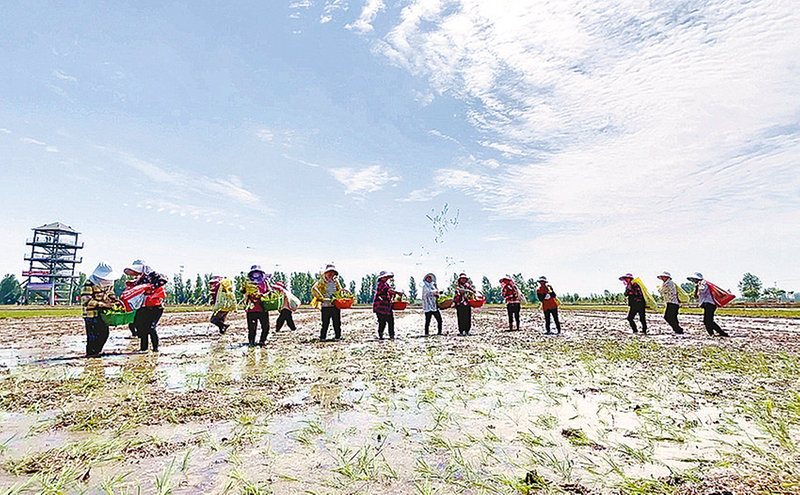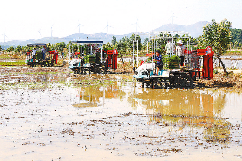 确山县禾嘉生态农业发展有限公司员工负责此次插秧任务。稻田里,机械化插秧和人工抛秧同时进行,一片繁忙景象。一株株翠绿的秧苗均匀地立在田中,波光粼粼的水田犹如披上了绿装。