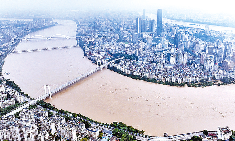 这是6月19日拍摄的柳江柳州市区段(无人机照片)。受强降雨影响,广西柳江柳州市区河段水位快速上涨,柳江柳州水文站水位于6月18日8时53分涨至警戒水位82.50米,柳江出现2024年第1号洪水。目前,洪水正在下降。新华社记者 黄孝邦 摄