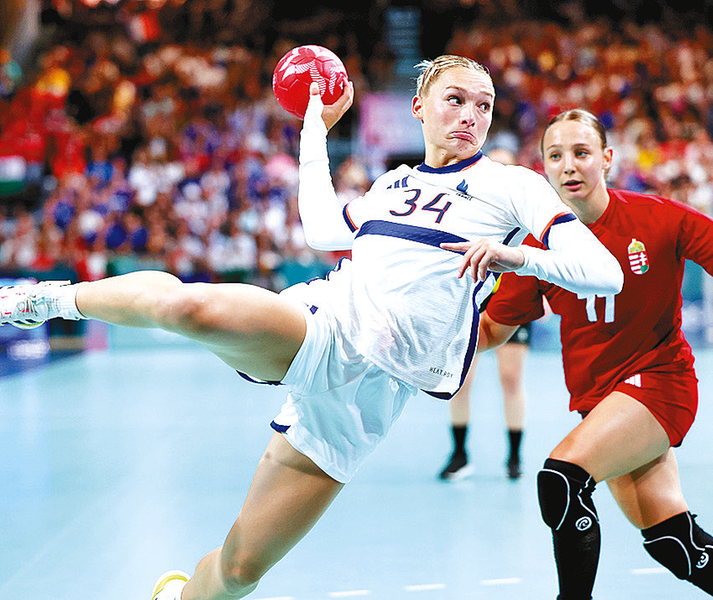 7月25日,法国队球员格朗沃(前)在比赛中进攻。当日,在巴黎奥运会手球女子小组赛中,法国队以31比28战胜匈牙利队。新华社记者 李 颖 摄
