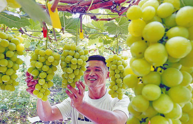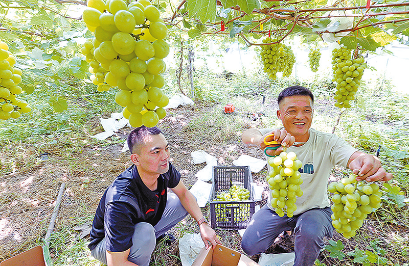7月29日,在驿城区水屯镇退役军人罗贵立承包的百亩生态果园里,葡萄缀满枝头,迎来了丰收季。罗贵立正在采摘成熟的葡萄。在他的带领下,附近20多名村民在果园里打工,实现家门口就业增收。