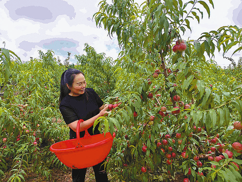 近日,泌阳县马谷田镇河南村相超林果种植基地100多亩青红色的枣味油桃挂满枝头,果农穿梭在桃园里忙着采摘鲜桃。 本报记者 方 祥 摄