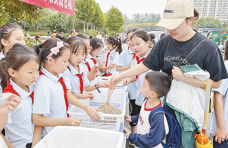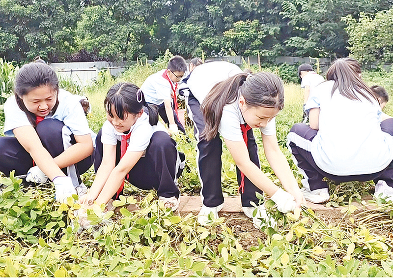 近日,在驻马店第二实验小学东校区劳动实践基地,一场以“乐享丰收好事‘花’生”为主题的劳动实践活动正如火如荼进行。