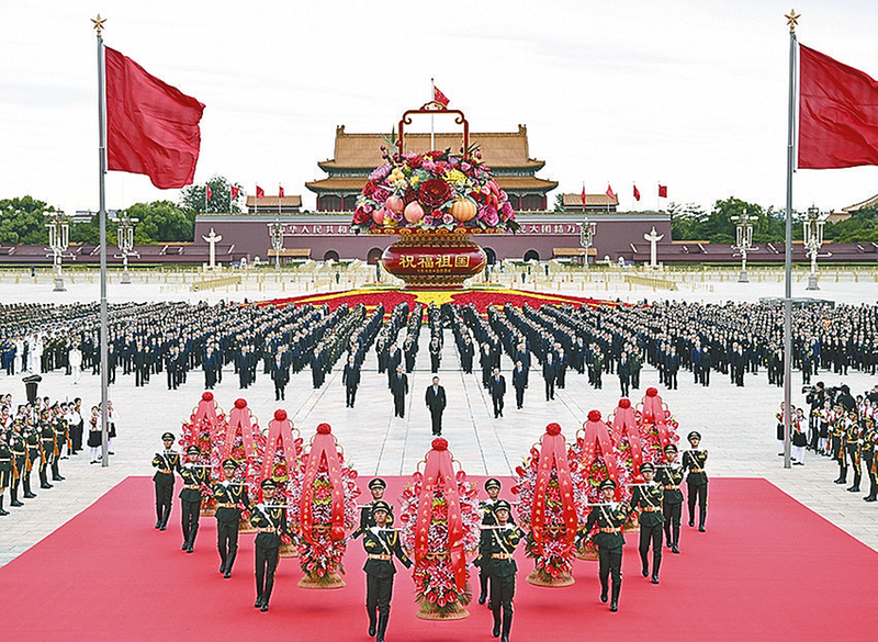 壮阔的天安门广场上,鲜艳的五星红旗迎风招展。广场中央,“祝福祖国”巨型花篮表达着对祖国繁荣昌盛的美好祝福。巍然耸立的人民英雄纪念碑北侧,两组花坛上镶嵌着白菊等鲜花组成的18个花环,寄托着全体中华儿女对英烈的深切缅怀。