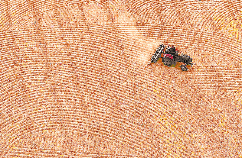 10月7日,在正阳县傅寨乡章庄村,农民驾驶收割机忙着收获花生和大豆。广袤的田野上机器的轰鸣声与村民的欢笑声交织在一起,构成一幅生动的秋收画卷。