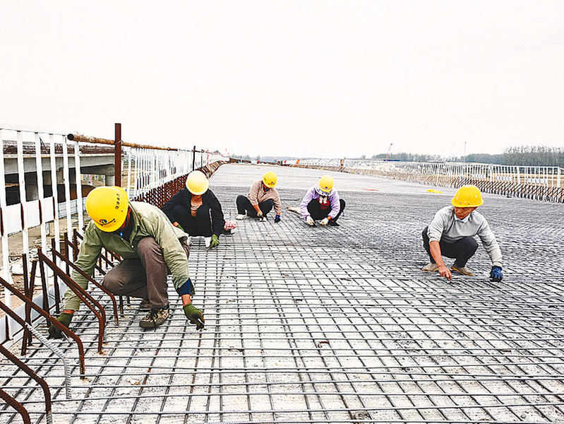 桥面钢筋绑扎施工。 本报记者 张 勇 文/图