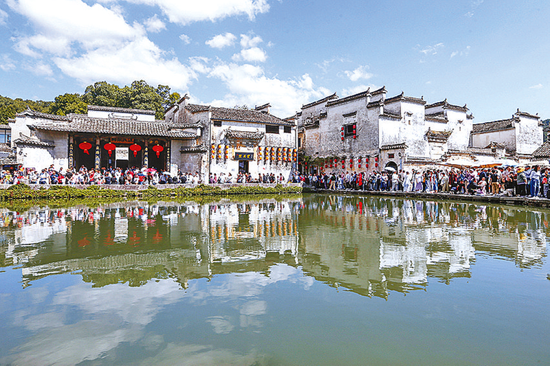 游客在世界文化遗产地安徽省黄山市黟县宏村游玩(10月3日摄)。新华社发 金秋十月,山河锦绣。