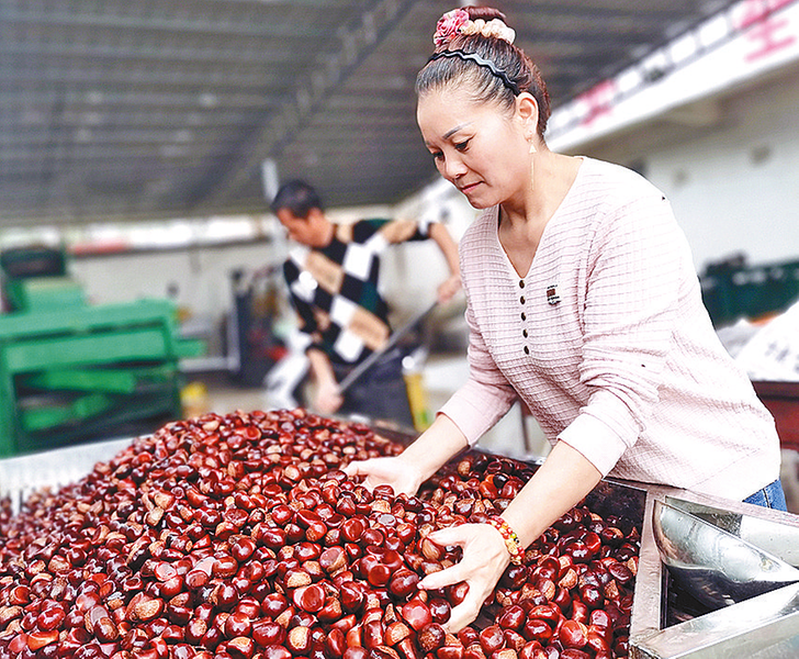 10月18日,在确山县石滚河镇何大庙村板栗加工厂,工人正在搬运、筛选刚刚采摘的板栗。该村出产的红油栗品质高、俏销市场,成为栗农的“致富果”。本报记者 郭建光 摄