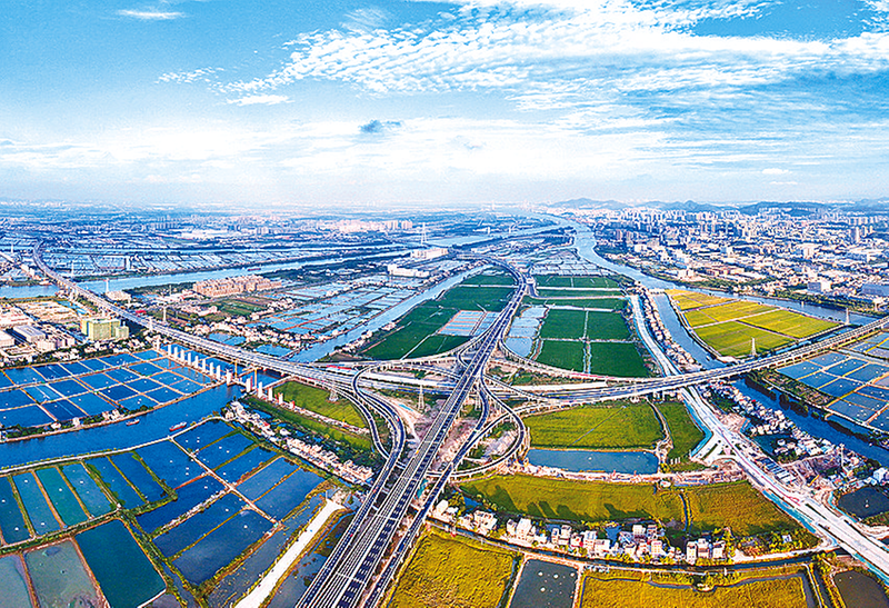 在水网密布的珠三角冲积平原,南中高速新隆互通横跨广澳高速(10月17日摄,无人机照片)。中交路建承建的广州南沙至中山高速公路目前已建设完成,静待通车。与深中通道无缝对接的南中高速横跨广州、中山两市,南通珠海、西进江门、东达深圳,串联起粤港澳大湾区核心区域东西南北大通道。通车后从广州南沙15分钟可至中山城区,20分钟可达深圳宝安。