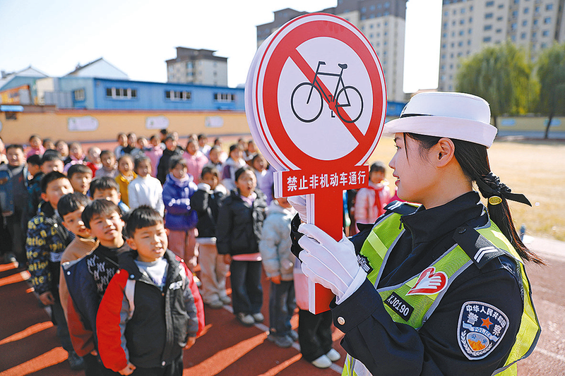 12月2日,河南省焦作市温县交警大队民警在温县第二实验小学指导学生认识交通标识。当日是第十三个“全国交通安全日”,主题为“文明交通 携手共创”。各地学校开展交通安全主题活动,提高师生的交通安全意识和自我保护能力。 新华社发
