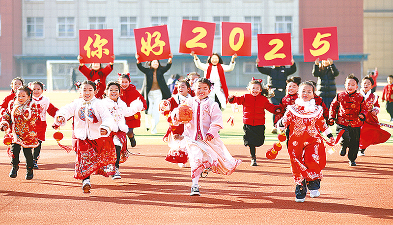 2024年 12月31日,山东省临沂市郯城县第一实验小学的学生穿着传统服饰,喜迎新年的到来。当日是2024年的最后一天。岁序更替,华章日新。辞旧迎新之际,在祖国的各个角落,人们在平凡烟火中追寻生活的美好。 新华社发