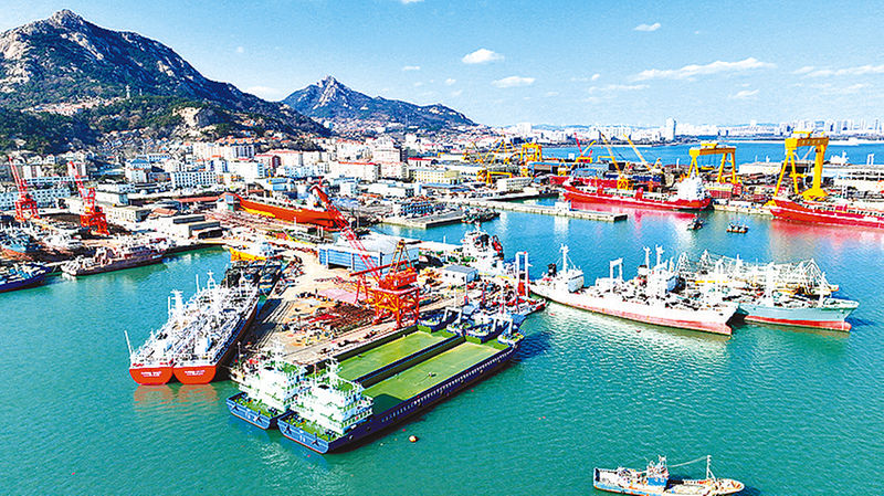1月2日,山东省荣成市石岛管理区石岛湾畔一家造船企业船坞内,多艘大型船舶在加紧建造。
