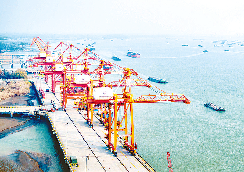 这是1月4日拍摄的江苏省扬州港集装箱码头(无人机照片)。新年伊始,国内各大港口货轮进出,各作业码头运输车辆穿梭如织,一派繁忙景象。