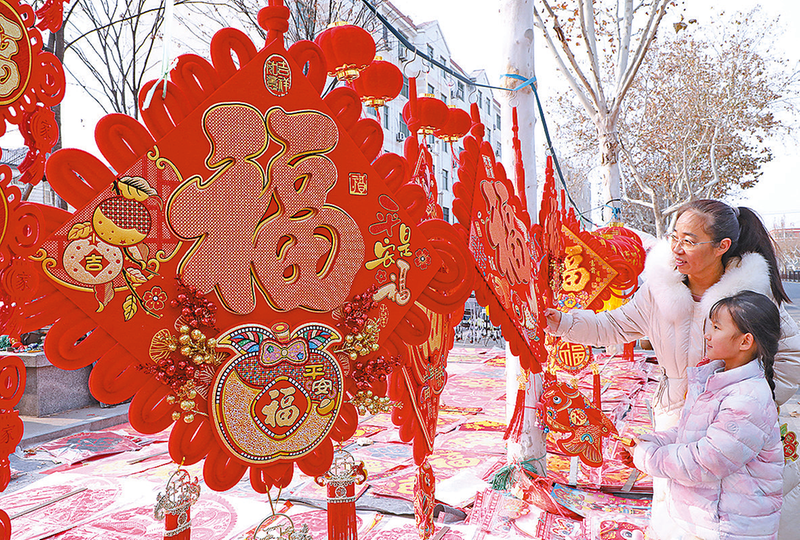 1月22日,在山东省滨州市博兴县年货大集,一对母子在选购中国结。