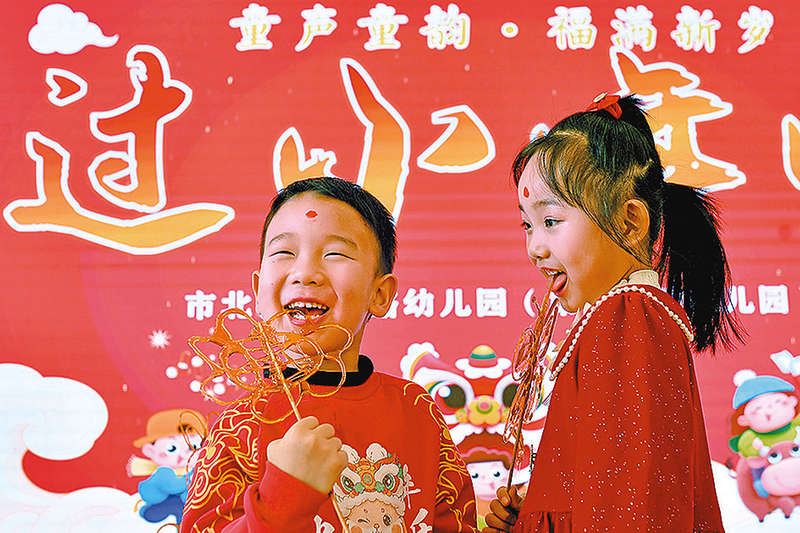 1月21日,在山东青岛高安路幼儿园开展的“学年俗 品年味”主题活动上,两名小朋友在品尝糖画。