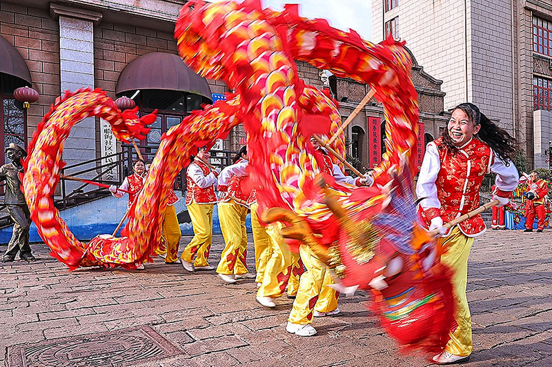 1月22日,民间艺人在江苏连云港市连云老街表演舞龙。