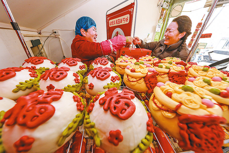 1月22日,顾客在河南省商丘市睢阳区一家花馍店购买花馍。