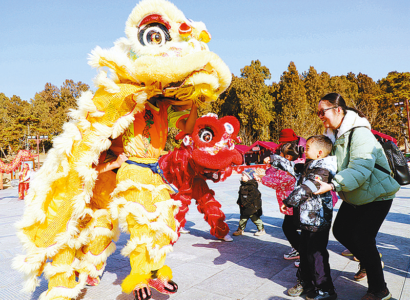 2025年1月28日,在河南南阳卧龙岗文化园内,市民欣赏舞狮表演。
