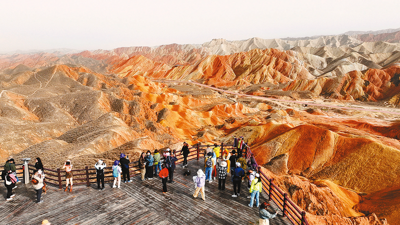5月4日,游客在位于甘肃省张掖市的七彩丹霞景区游览。 新华社发