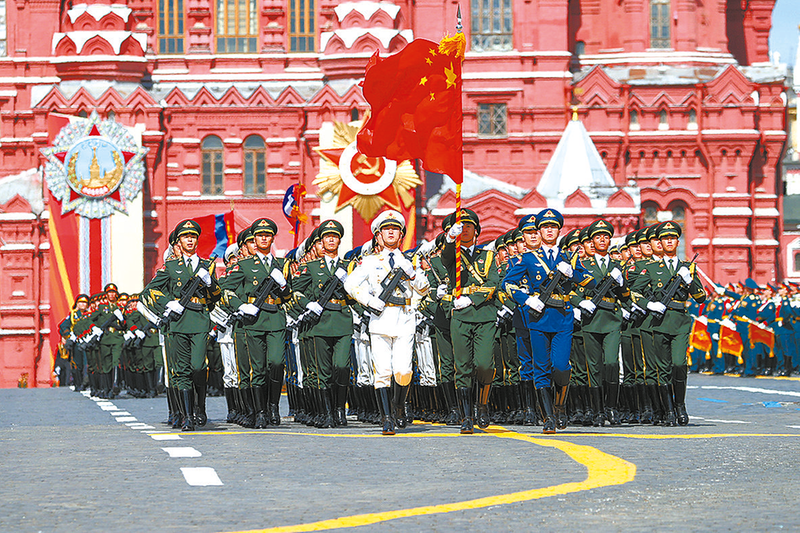 5月9日,在俄罗斯首都莫斯科,中国人民解放军三军仪仗队方队参加纪念苏联伟大卫国战争胜利80周年阅兵式。
