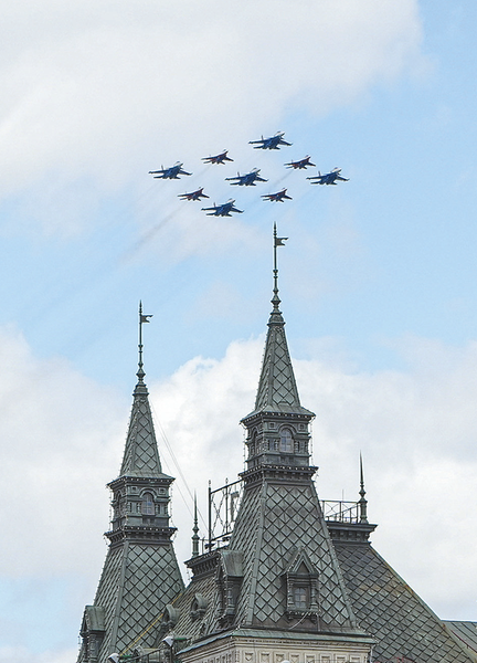 5月9日,在俄罗斯首都莫斯科,飞行编队参加纪念苏联伟大卫国战争胜利80周年阅兵式。