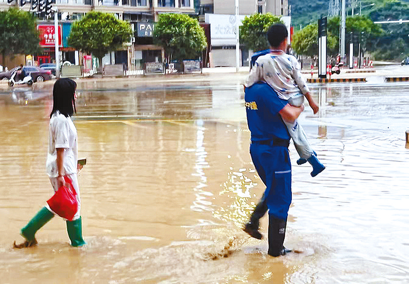 当看到一位怀抱幼童的女子在积水前手足无措时,正在清理垃圾的王振喜立刻放下手中的工具,蹚着齐膝深的积水过去帮忙。