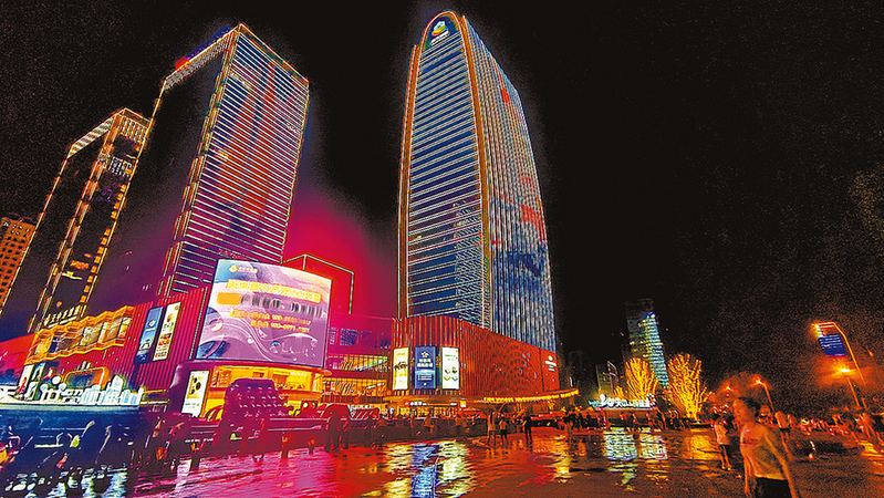 近日,夜幕降临,华灯初上,市民走出家门到天中环球港赏夜景、逛夜市,尽享休闲好时光。