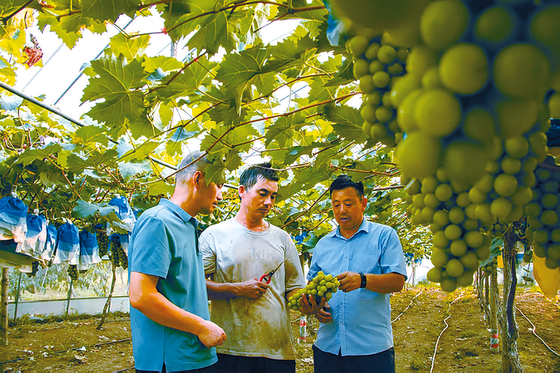 8月5日,在正阳县清源街道唐段社区阳光玫瑰种植基地,果农马松伟正剪下成熟的果子,笑意盈盈。游客穿梭藤蔓间进行采摘,享受着采摘的乐趣。