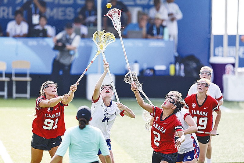 8月8日,英国队球员温彭尼(左二)与加拿大队球员迪安(左一)、布莱克(左三)在比赛中拼抢。 当日,在四川省成都七中东部学校田径场举行的2025年成都世运会女子棍网球预赛A组比赛中,加拿大队14比10战胜英国队。 新华社记者 陈 斌 摄
