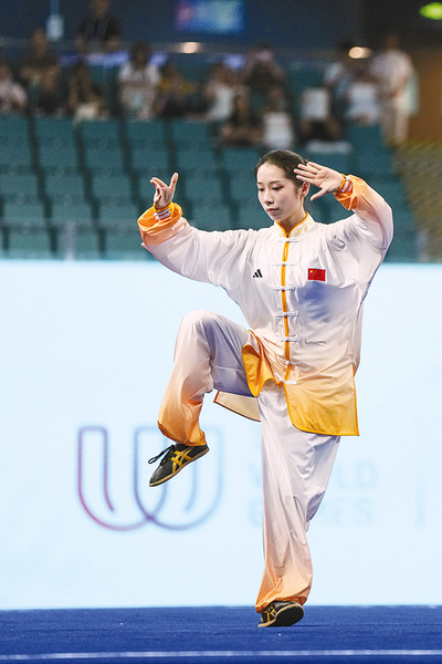 8月8日,中国选手卢卓灵在太极拳比赛中。当日,2025年成都世运会女子太极拳—太极剑决赛在成都高新体育中心举行。 新华社记者 胥冰洁 摄