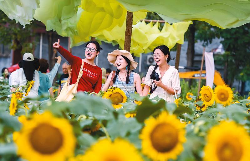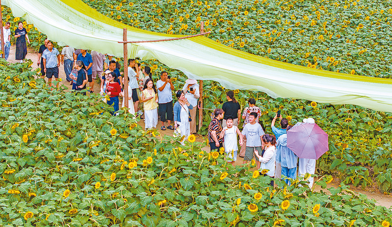 8月12日,游客在河南省驻马店市西平县老王坡产业融合发展示范区的百亩油葵花海游玩。