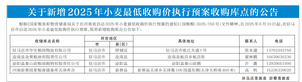 关于新增2025年小麦最低收购价执行预案收购库点的公告