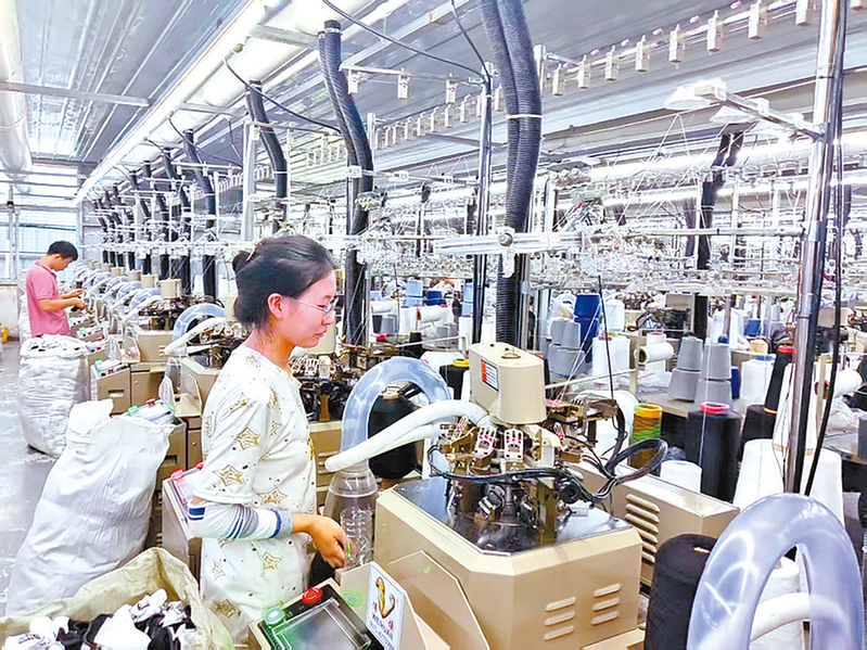 近日,记者在确山县新安店镇周庄村恒宇袜厂生产车间看到,一排排全自动化生产设备有序运行,工人在忙着进行产品出厂后的检验、把关、规整、包装。