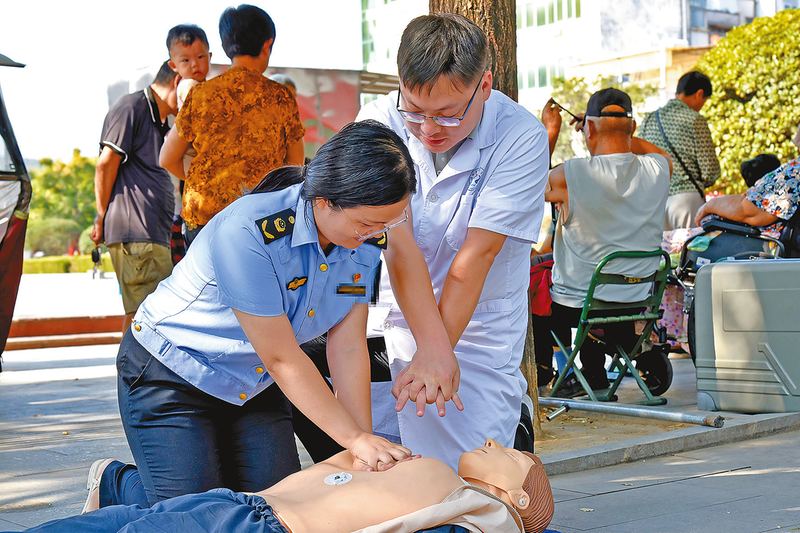 近日,确山县人民医院在靖宇广场开展“全民健康生活方式宣传月”义诊活动,急诊科医护人员现场演示心肺复苏操作。