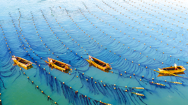 9月11日,在山东省荣成市爱伦湾海洋牧场,渔民驾驶渔船从事海上生产(无人机照片)。