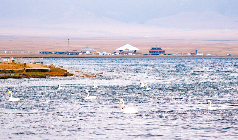 9月10日,天鹅在新疆赛里木湖游弋。 新华社记者 张浩波 摄