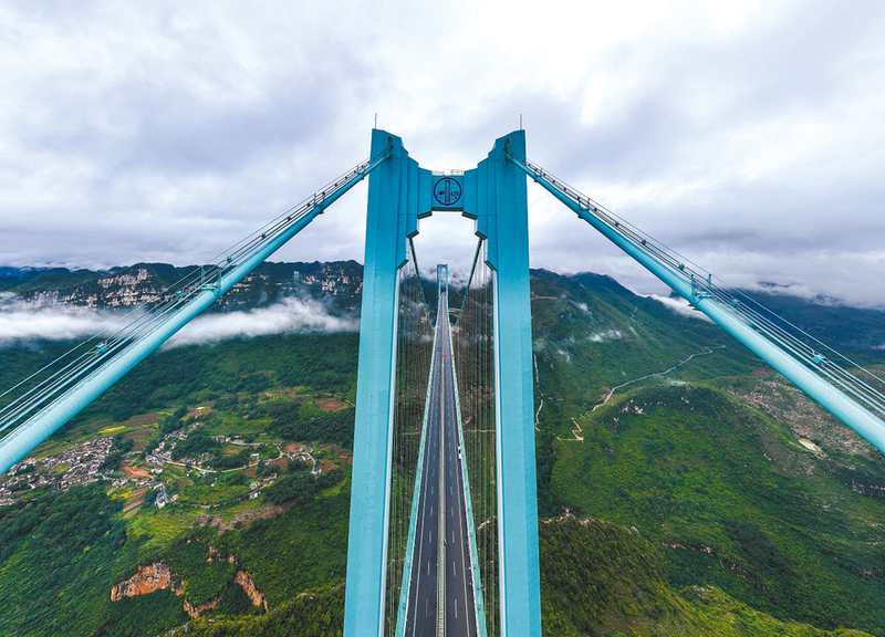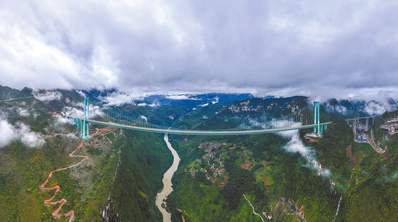 9月26日,雨后的贵州花江大峡谷云雾笼罩,花江峡谷大桥如同“钢铁巨龙”腾跃峡谷之上。花江峡谷大桥是贵州六枝至安龙高速公路的控制性工程,大桥全长2890米,主跨径1420米,是目前世界山区峡谷第一大跨度钢桁梁悬索桥;其桥面距水面垂直高度625米,是新的世界第一高桥。经过三年多建设,贵州花江峡谷大桥将于9月28日正式建成通车。