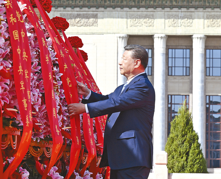 习近平迈步上前,仔细整理花篮缎带。随后,习近平等党和国家领导人缓步绕行,瞻仰人民英雄纪念碑。