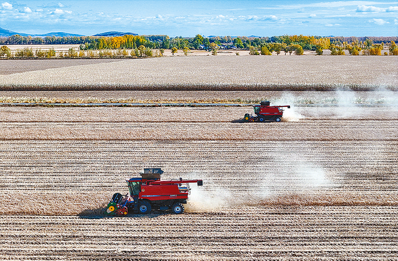 10月8日,在黑龙江省佳木斯市富锦市砚山镇,农机在进行大豆收获作业(无人机照片)。寒露时节,黑龙江省各地抢抓农时忙农事,田间地头一片繁忙景象。 新华社发