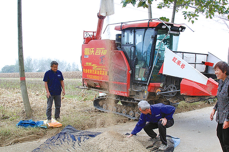 10月9日,在新蔡县孙召镇郎庄村广袤的田野里,机声隆隆,800余亩芝麻迎来了收获期。几台大型联合收割机来回穿梭,开足马力对芝麻进行抢收。