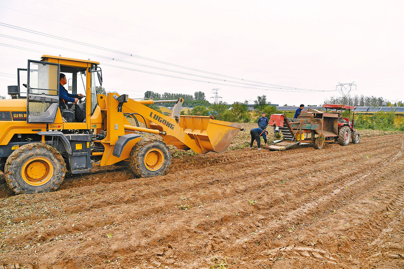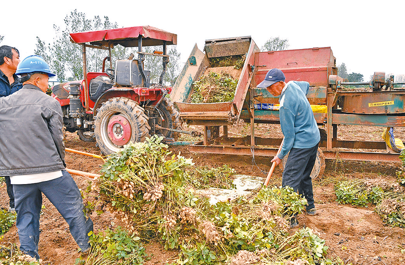近日,趁着阴雨暂歇,驿城区水屯镇及时协调采收机械,帮助种植大户姚喜林收获花生。
