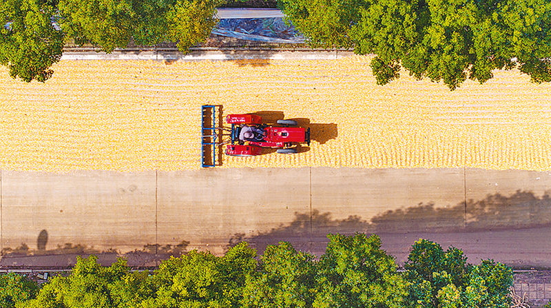 近日,河南省驻马店市西平县二郎镇小王庄村,一辆农用车在翻晒玉米(无人机照片)。