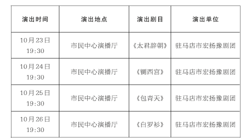 为满足人民群众高品质精神文化需求,根据省委宣传部安排,驻马店市宏扬豫剧团将在市民中心演播厅举办4场豫剧演出活动,欢迎市民群众前往观看!