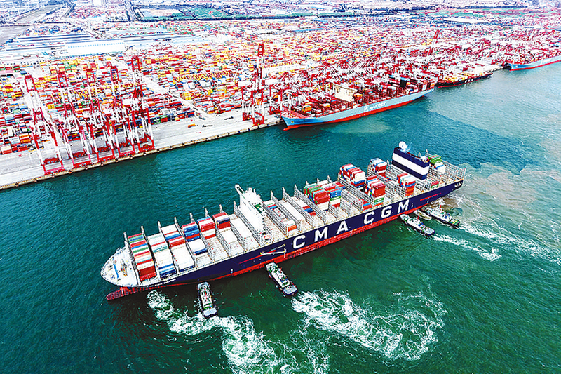 10月20日,在山东港口青岛港,一艘货轮在拖船辅助下停靠集装箱码头(无人机照片)。 新华社发 新华社记者 王雨萧 张晓洁