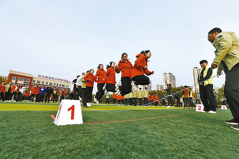 齐心协力跳大绳。