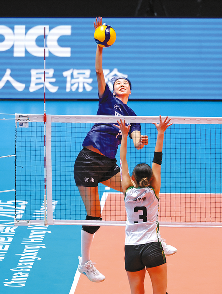 11月12日,河南队球员朱婷在比赛中进攻。当日,在澳门举行的第十五届全国运动会女子排球成年组小组赛A组比赛中,河南队3比0战胜北京队。 新华社发