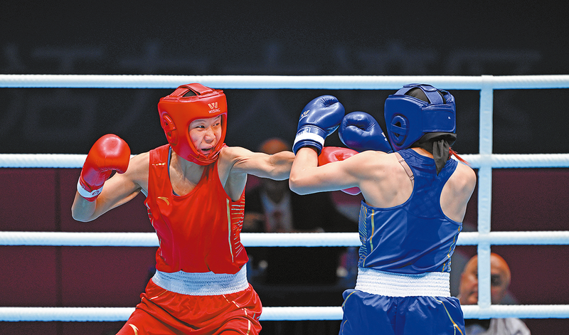 11月12日,李书(左)与禹立赛在比赛中。当日,在深圳进行的第十五届全国运动会拳击女子66公斤级决赛中,河南队选手李书获得亚军。 新华社记者 杨冠宇 摄