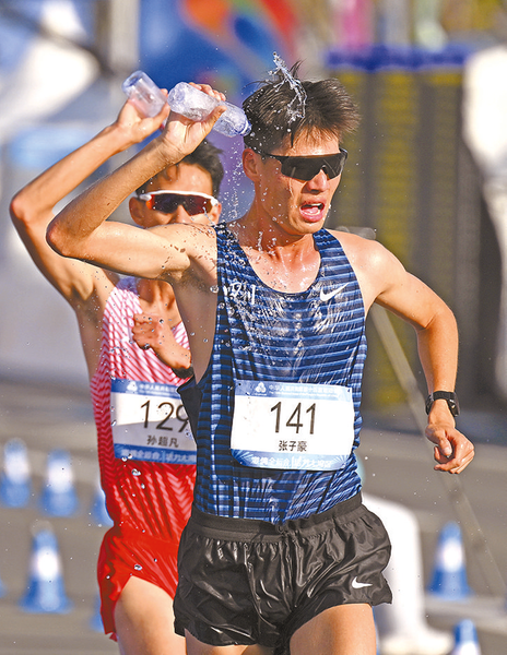 11月12日,四川队选手张子豪(右)、河南队选手孙超凡在比赛中补充水分,为身体降温。当日,第十五届全国运动会田径项目男子20公里竞走决赛在广东珠海举行。新华社发 新华社广州11月11日电(记者 刘 旸)第十五届全国运动会11日的比赛中,“小孩哥”“小孩姐”成为主角。13岁的于子迪在女子200米个人混合泳决赛中破亚洲纪录夺冠,滑板项目摘得奖牌的12人中有9人尚未成年。