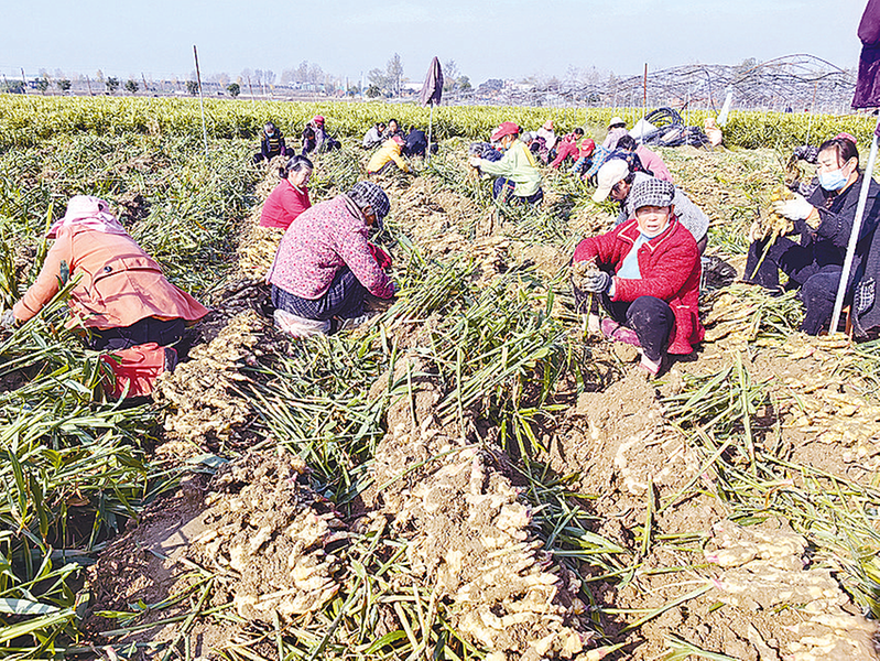 11月13日,在正阳县慎水乡刘桂庄的姜田里,200多名村民正趁天抢时采收生姜,田间地头一派喜人丰收景象。生姜丰收,给种植户带来可观经济效益,同时也为附近村民提供了就业岗位。
